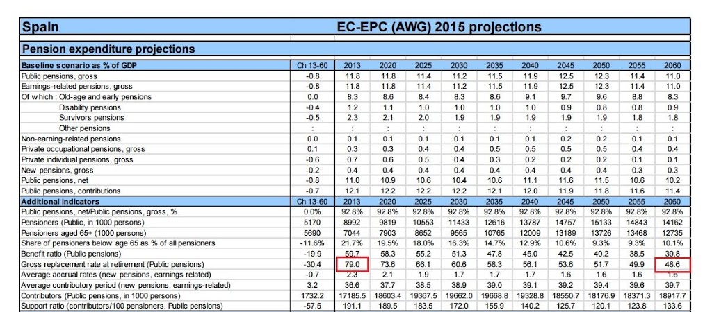 … el documento de la Comisión Europea presupone un importantísimo deterioro de las condiciones de acceso a la jubilación de los ciudadanos españoles. En particular, la Comisión prevé un hundimiento de la tasa de reemplazo de las pensiones públicas desde el actual 79% hasta el 48,6% en el año 2060. ¿Qué es la tasa de reemplazo? Pues simplemente el porcentaje del último sueldo que cobramos en forma de pensión. Por tanto, mientras que en la actualidad el pensionista medio cobra casi el 80% del último salario que percibía antes de jubilarse, en el año 2060 apenas ingresará el 48%: en términos relativos, pues, el informe de la Comisión Europea al que nos remite la ministra de Trabajo para demostrarnos la viabilidad de la Seguridad Social española augura un hundimiento de las pensiones del 40%. Solo con ese gigantesco recorte, de hecho, las pensiones públicas terminan siendo viables.